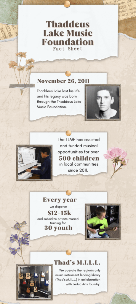 Thanks to the support of the community the Thaddeus Lake Music Foundation has been able to help children and youth gain access to music education and opportunities. We have been registered as a nonprofit organization under the Alberta Society Act since July 2017 (Alberta Incorporation Number 5020548151).